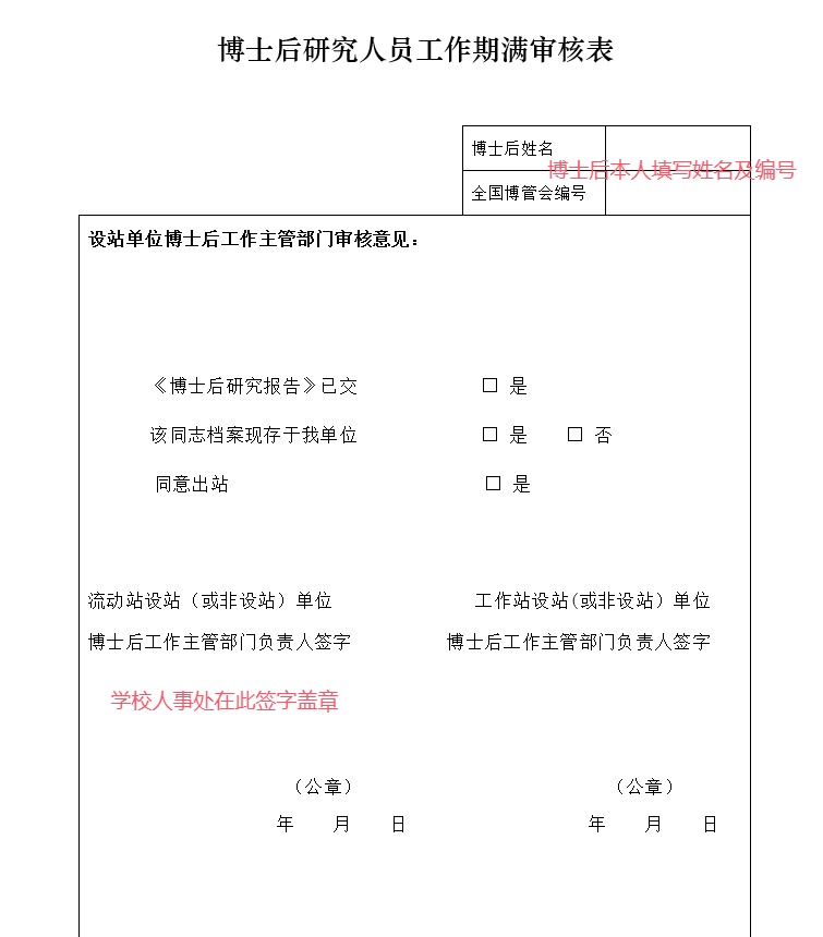 4. 《长安大学博士后出站考核表》1份(长安大学博士后官网下载并填写);